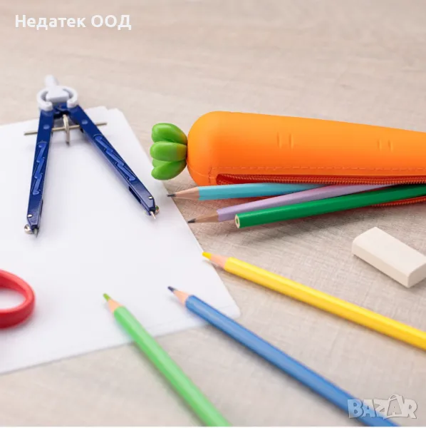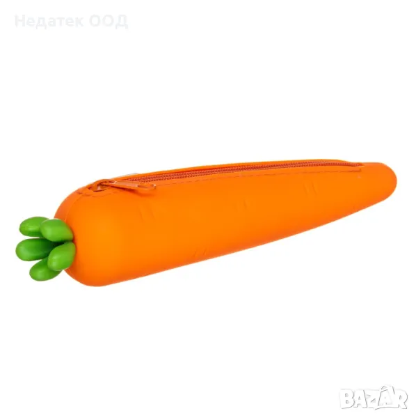 Силиконов ученически калъф в оранжев цвят и форма на морков. Има едно отделение и се затваря с цип.