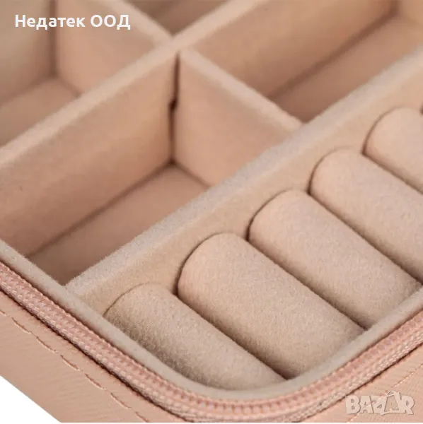 Кутия за бижута за организиране на бижута у дома, на пътуване или на почивка. С велурена подплата в 4-те отделения и джобовете с халки, розова външна част и цип.Кутиите за бижута са идеалното решение за организиране на вашите бижута. С пространства и чекмеджета те ви помагат да подредите всичките си бижута, без да се обърквате, да ги намерите веднага и по този начин да ги предпазите от прах и повреда.