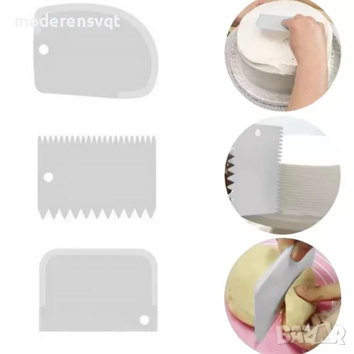 3 ШПАТУЛИ ЗА ДЕКОРАЦИЯ – Към чинията са включени 3 бр. декоративни шпатули, служат за разнасяне и заглаждане на масата. Всеки от тях има различен модел. Благодарение на тях всяка шарка на тортата ще бъде интересна.