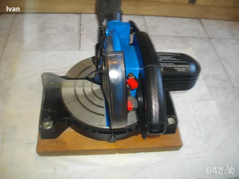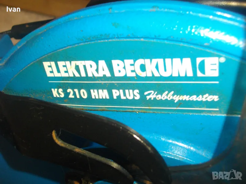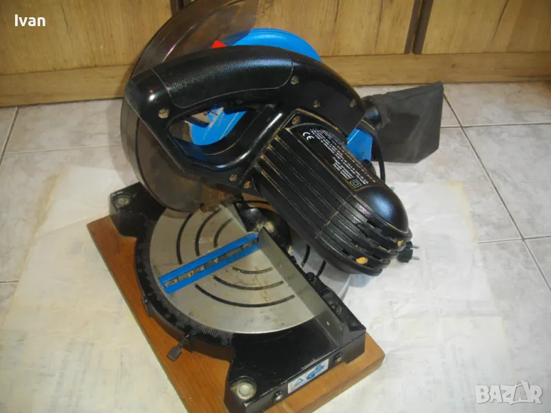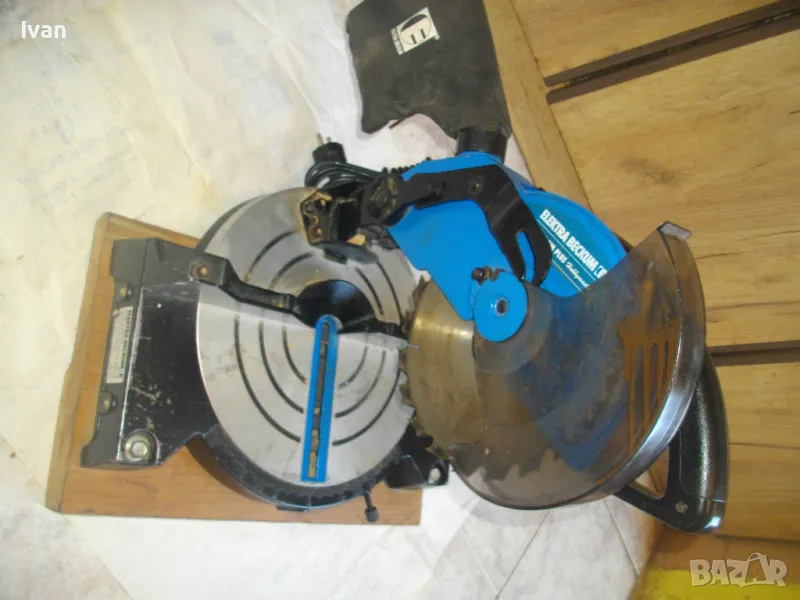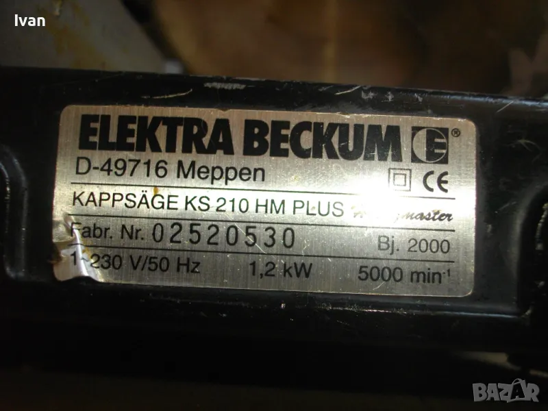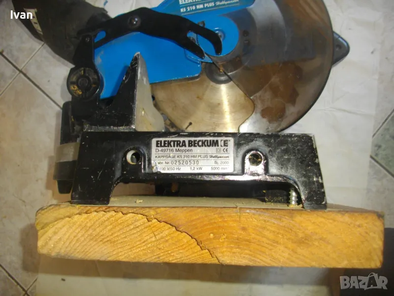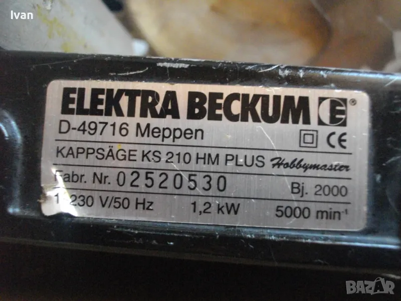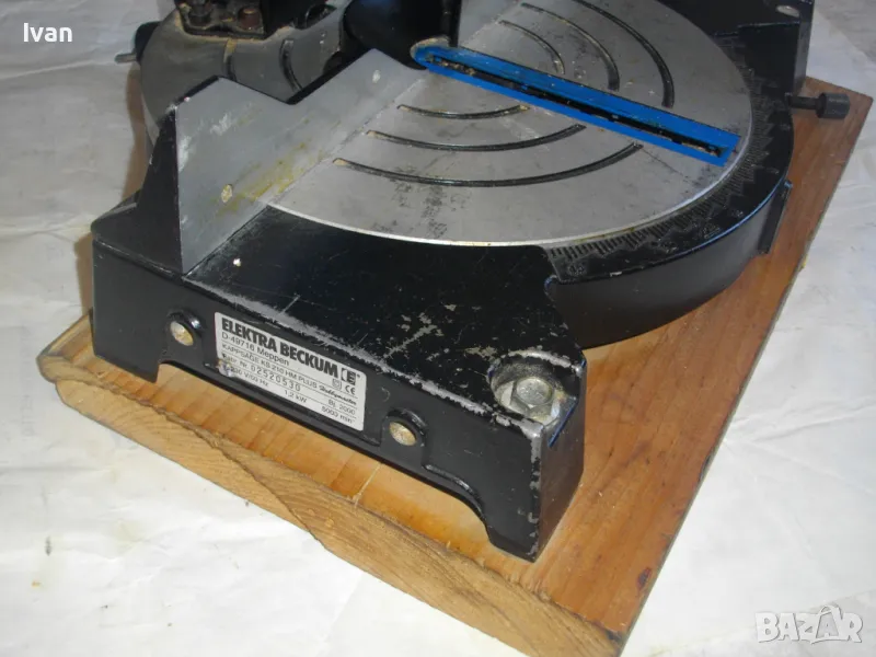 ОПИСАНИЕ на синя пендула с дървена допълнителна основа. Немско произовдство 2000г. . Марка и модел - Electra Beckum, модел Meppem KS210 HM - Plus Hobbymaster. Запазен външен вид на машината и добро техническо състояние. Мощност на мотора - 1200 вата, скорост 5000 об/мин. За големи дискове размер ф 210 мм. Наклон на рязане 0-45 градуса. Налична торба платова на конектора на отпадъчна прах. Диск отличен, с видирани твърдосплавни частици на зъбите. Забележка към диска - пластмасовия прозрачен предпазител се е извадл от металния обтегач, който го отваря и трябва да се оправи, но това не пречи на работата на машината. Алуминиев плот на пендулата. Машината е захваната за допълнителна здрава и стабилна дървена основа с размери 420 х 155 мм. Тегло на машината с дървената основа - 10,0 кг.