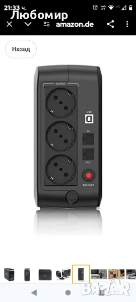 Гнезда и изходи: UPS е оборудван с 3 Шуко изхода, които също са съвместими с италианския щепсел, и интегриран захранващ кабел с Шуко щепсел