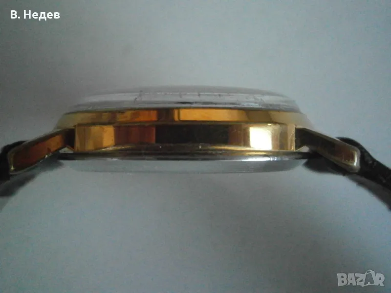 Размери: на касата - без коронката - 34мм, мн. добре запазена /без протривания/; широчина при лъговете - 18 mm; висичина на часовника със стъклото - 9,5мм. Часовникът е с кожена каишка... не нова.