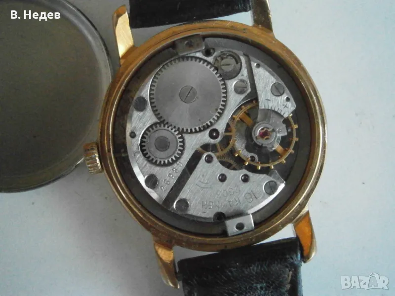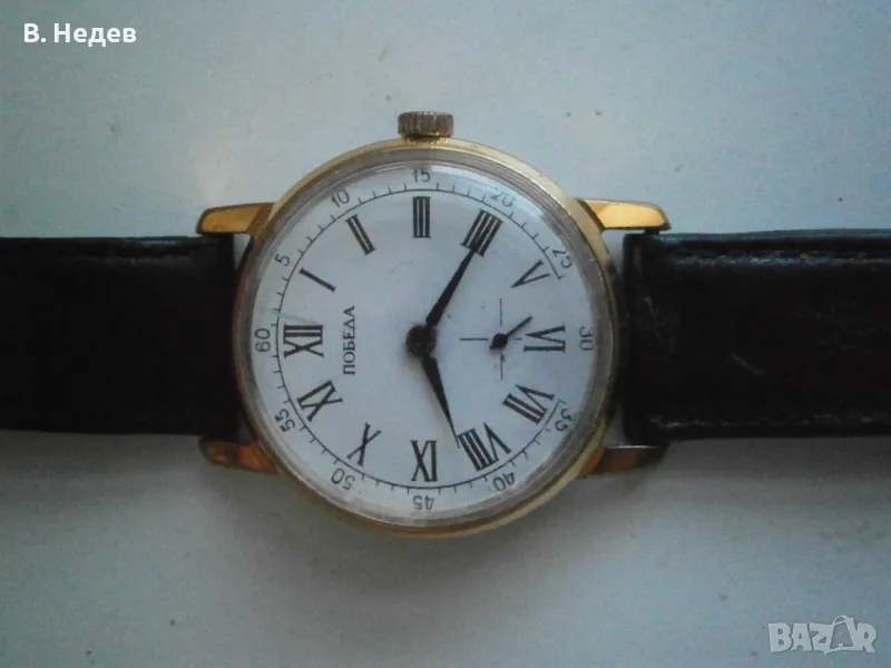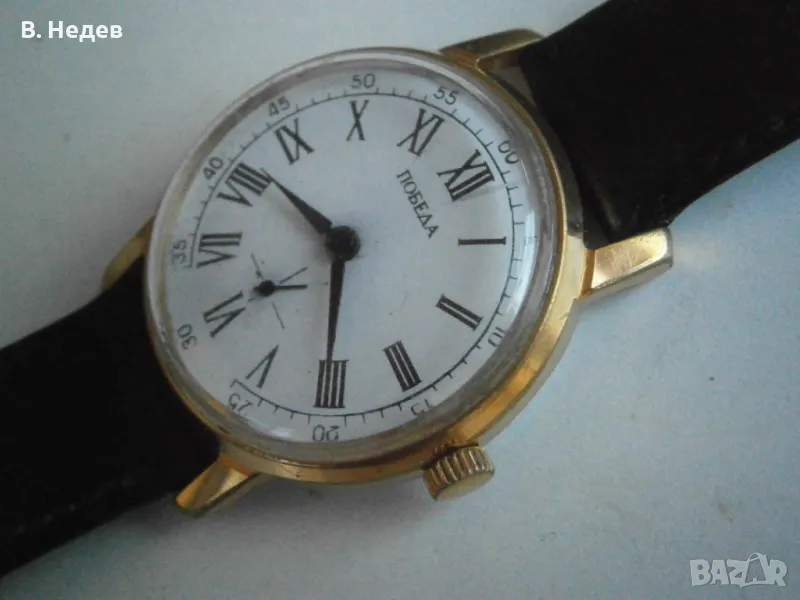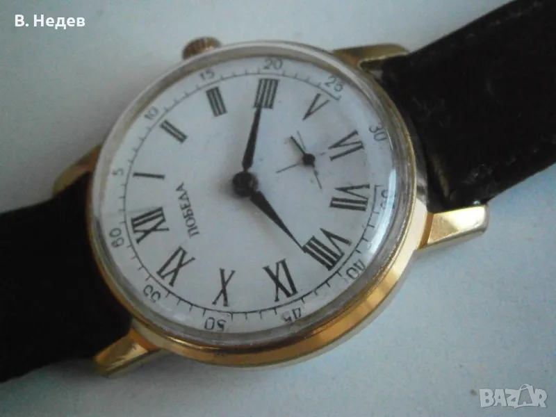 Продаваме този изключителен руски /съветски/ часовник с ръчно навиване, отлично състояние, мн. запазен - циферблат, цифри - римски, стрелки, печат и машина - моля разгледайте подробно снимките! Часовника е с мн. качествена машина - калибър 2603, със 16 рубинови камъка, противоударен прецизен баланс, секундарна стрелка - "на 6 часа", амортисьор на баланса - действително противоударен часовник. Надеждна и безотказна машина. Вибрации на баланса - 18000/час. Часовникът поддържа точно време за механичен часовник - +35-40sec/ 24 h. Запас на хода - около 40 часа. Надписите върху циферблата: ПОБЕДА. Позлатена каса - "12,5+ ", маркирана!