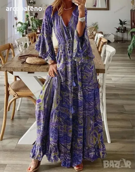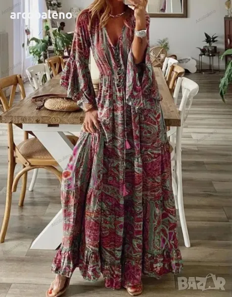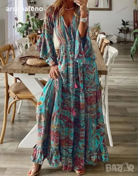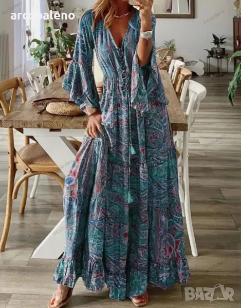 Дамска ежедневна рокля с висока талия и щамповано V-образно деколте в бохемски стил, 6цвята