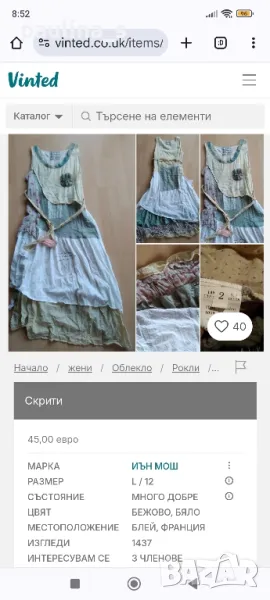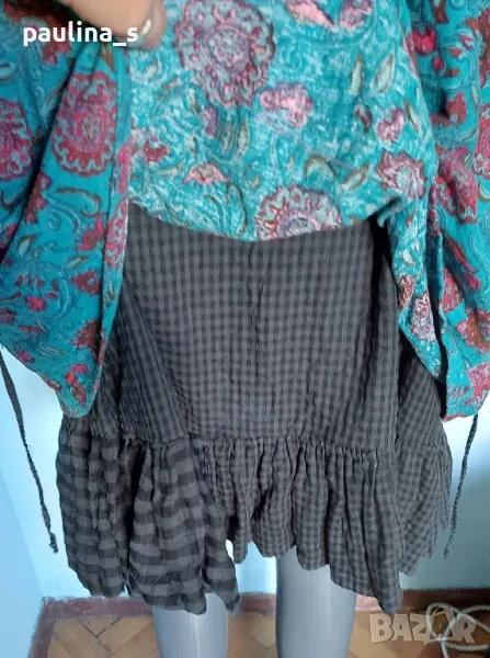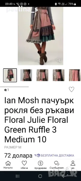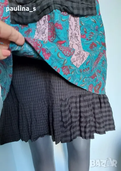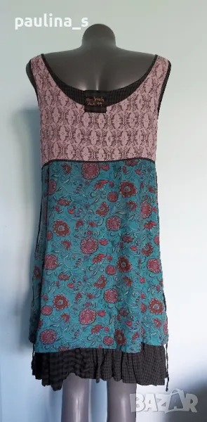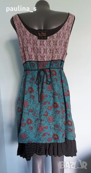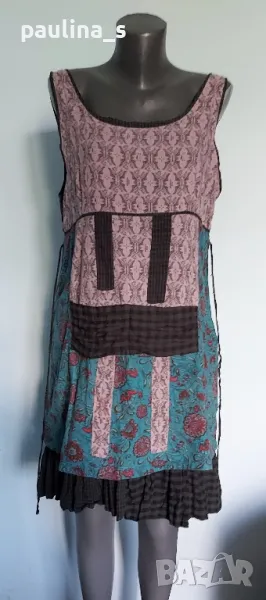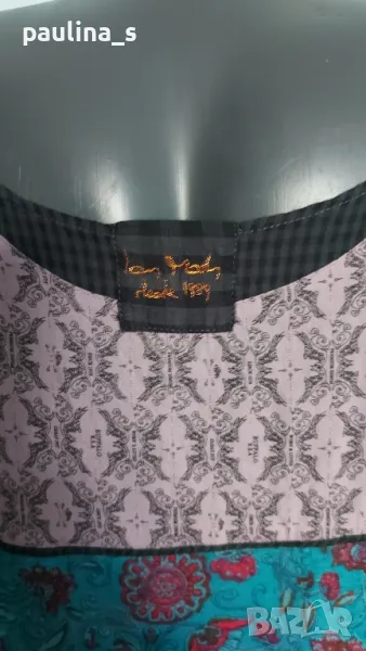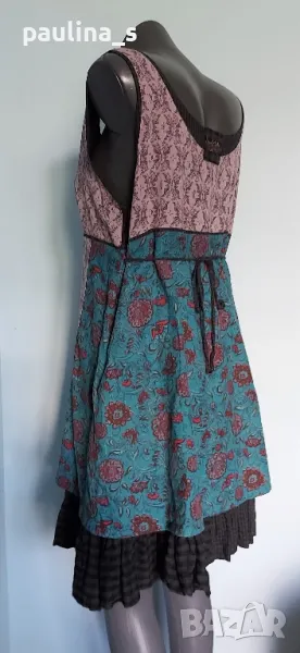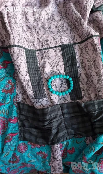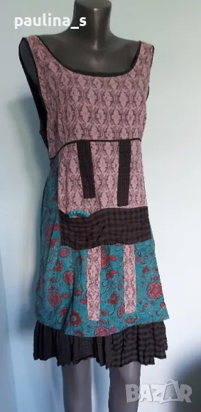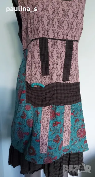 1️⃣. L / XL - "Ian Mosh". Цената е крайна 59,99лв / 30 евро. Рядка находка! Изумителна пачуърк рокля тип сукман, изработката е перфектна от няколко вида памучни плата - синият е бархет, другите са по-фини. Има скрит цип в стани, декоративни джобове и бродирано лого. Поради модела може да се носи от няколко размера, посочени са. Няма дефекти, само ефекти, а тюркоазената гривничка е подарък. Страхотна дреха, уникат.