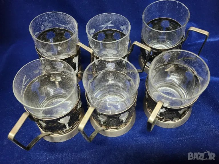 подстакани мелхиор - 2 к-та х 6 броя с оригинални чаши, мод. "Горкий" и мод. "Латы", посребрени СССР