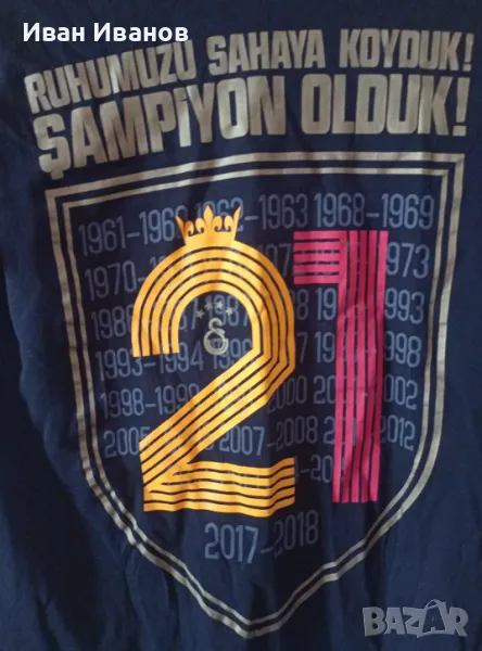 Оригинална фенска тениска на Галатасарай в перфектно състояние. Не е обличане даже. Всички етикети и серийни номера са налични. Тениската е по случай спечелването на 21-вата титла на Галатарасай. Закупена през 2018г. по време на празненствата за титлата в Инстанбул. Размер С.
