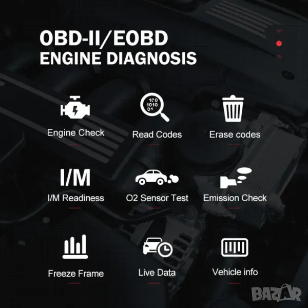 • Четене на кодове за грешки на двигателя с необходимата информация за диагностициране и разрешаване на проблемите автомобила.