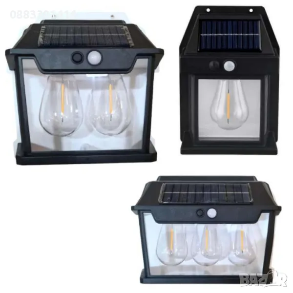 Стенна лампа с 1, 2 или 3 LED крушки, сензор за движение и фотоволтаичен панел за външна употреба, водоустойчива