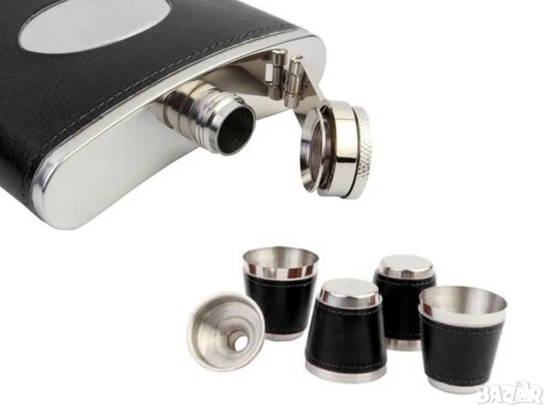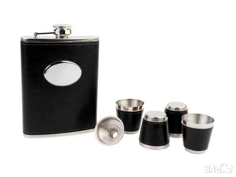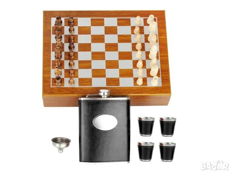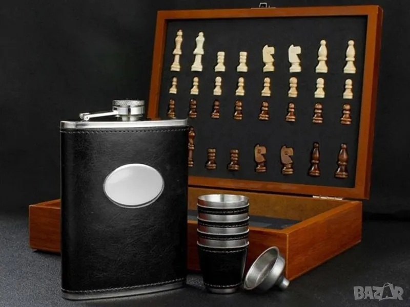 Луксозен комплект шах с 4 чаши, бутилка уиски, фуния и набор от 32 фигури за шах.
