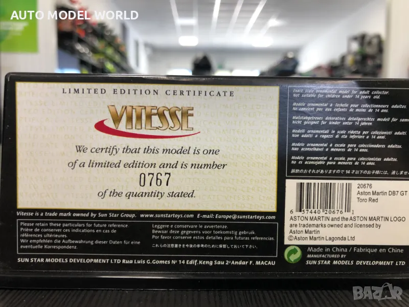 Оригинален Колекционерски модел метална количка VITESSE ASTON MARTIN DB7 GT 1:43 LIMITEDI EDITION N:767of 2500 цена 59лв.