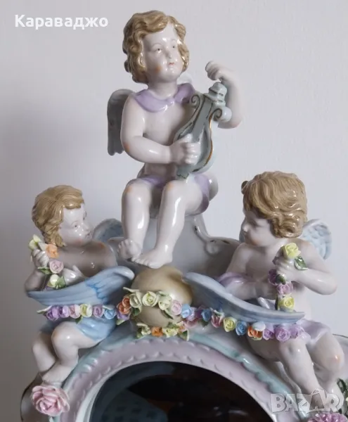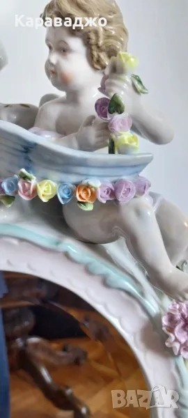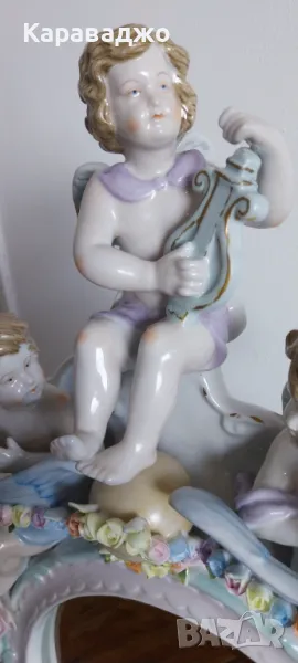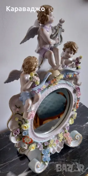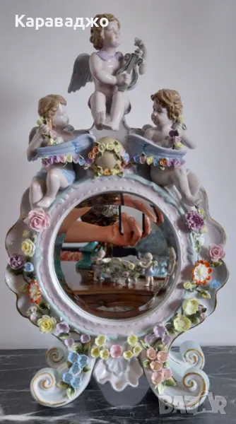 Антично/Колекционерско/Голямо/Настолно Огледало от края на 19 век.Ръчна изработка порцелан с изразени три херувима и много финни/красиви флорални мотиви.Кристално/оловно огледало с фасет.Високо 57см на 35см и дълбочина 16см.Състояние Перфектно-под единият херувим има пукнатина при изработката!