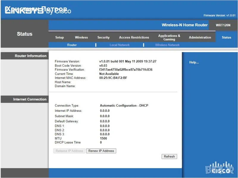 Продавам безжичен WiFi рутер Linksys by Cisco Wireless-N Home Router с модел WRT120N. Рутера поддържа максимална скорост до 150 Mbps на безжичния интерфейс. Изключително запазен, без никакви следи от употреба което може да се види на снимките. Инсталината е последна версия firmware - v1.0.01 build 001.