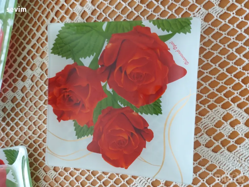 Стъклени чинии за хранене с принт на рози. Неизползван комплект. Комплекта включва два броя плата със страна 35 см. Съдовете са подходящи за измиване в съдомиялна машина. Изпращам с еконт.