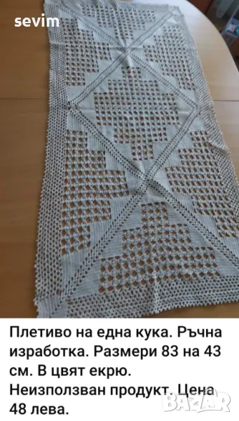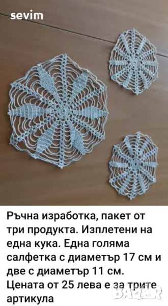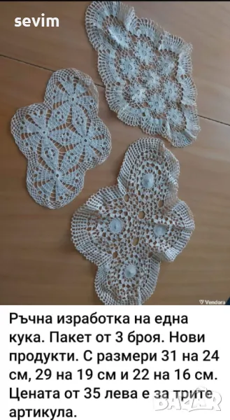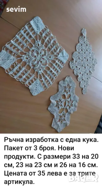 Всички артикули са от преди години от чеиз. Предлагам артикули, изплетени на една кука. На всяка снимка има описание и цени.