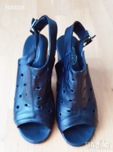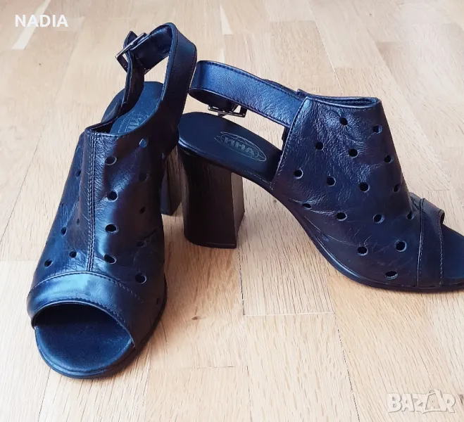 Отворени обувки тип сандал от естествена кожа, българско производство на Ина. Почти нови, обути по повод. Височина на тока 8 см, стелката е 24,8см. Напълно отговарят на 38.