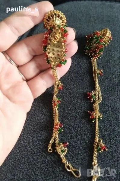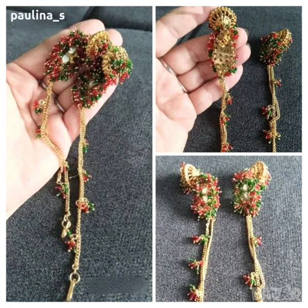3. Колаж / Индийски обеци в златисто с червени и зелени камъни. Цената е крайна 19,99лв. В края имат кукички, с които да се закачват за обеци на носа, слагани са за фотосесия, на практика са нови.