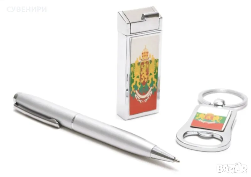 Луксозен подаръчен комплект включващ ключодържател, запалка и химикал. Запалката и ключодържателят са декорирани с гербът и знамето. Предлагат се в красива подаръчна кутия. Размери на кутията: 10х20х3 см