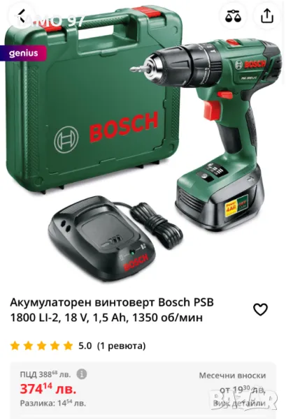 Продавам акумулаторен ударен винтоверт на Бош от зелената серия в отлично визуално състояние и работи перфектно, оригинално унгарско производство внос от Франция. Обявената цена включва машината с една батерия 18V 2.5AH без зарядно устройство при желание на клиента може да се добави и зарядно и тогава цената ще е 160лв. Пращаме с опция преглед и тест с куриерска фирма еконт може и лично предаване за гр. Шумен. Магазинската цена на винтовертта с 1.5Ah батерият е: 374лв.