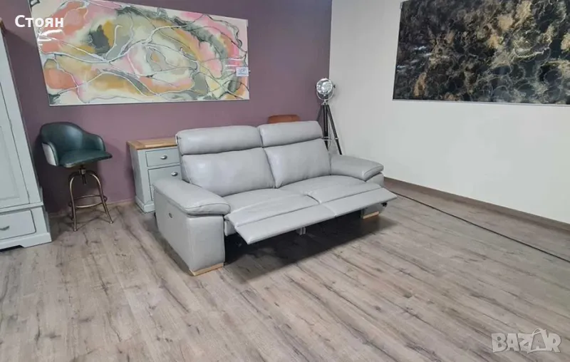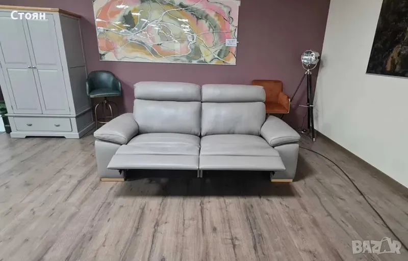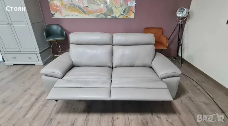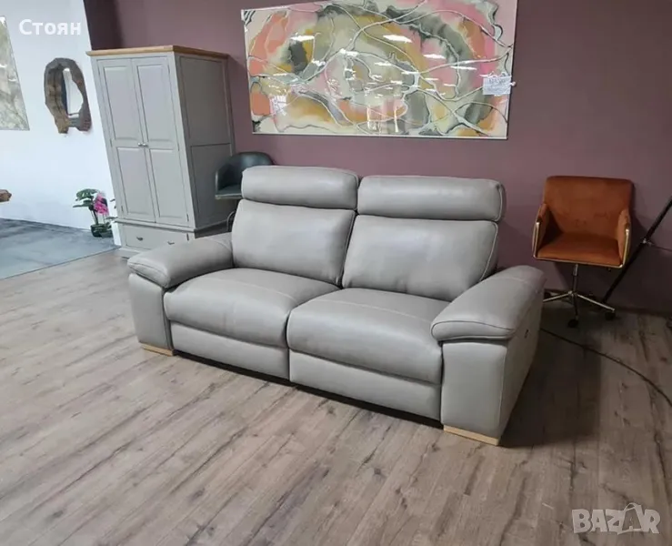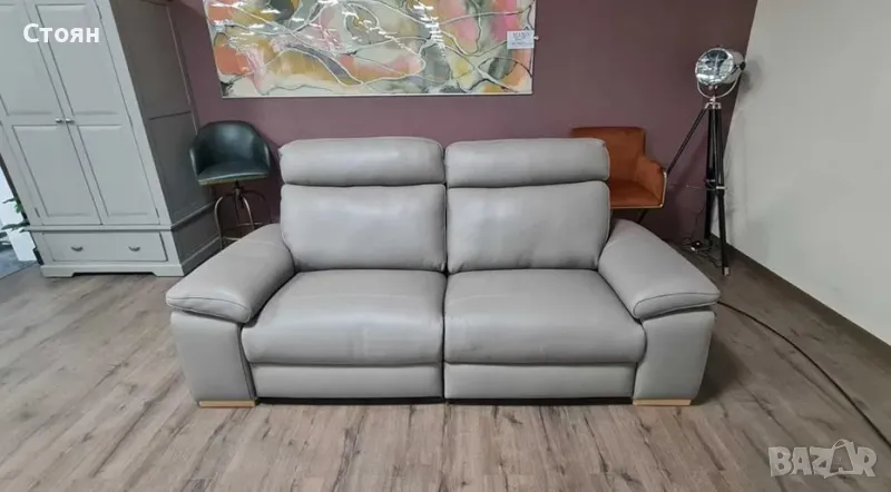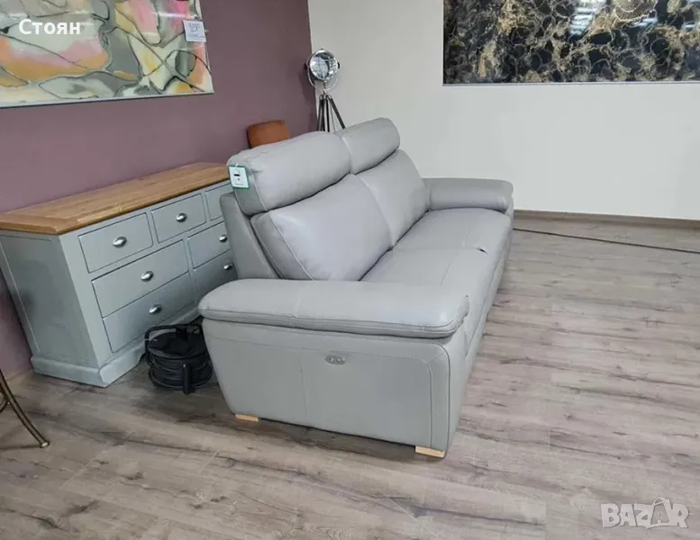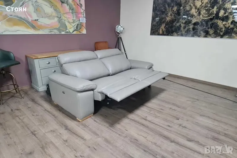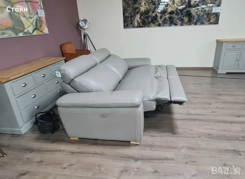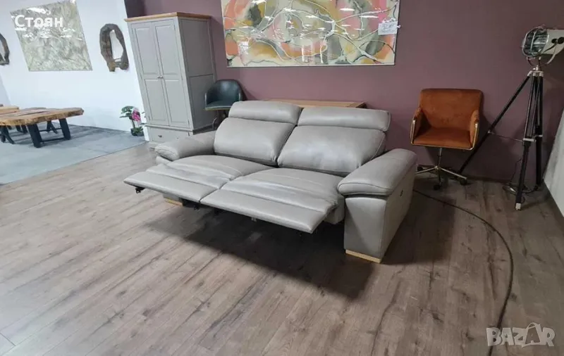 Италиански бежов кожен диван тройка с електрически релаксиращ механизъм за краката.