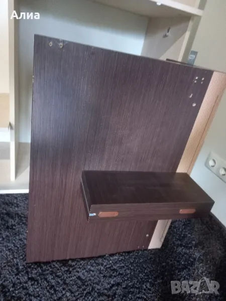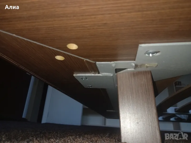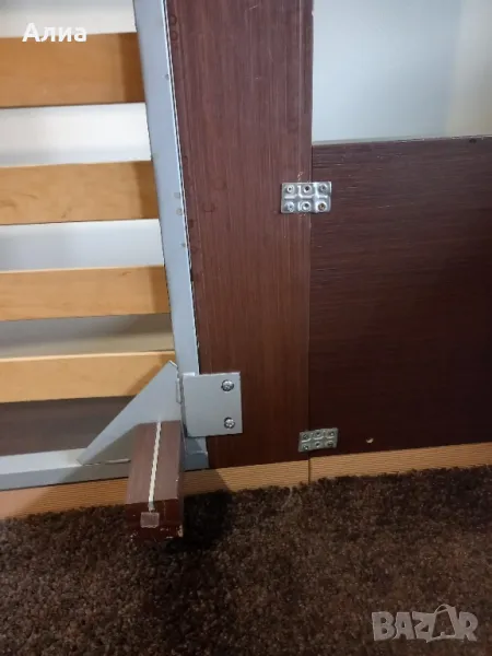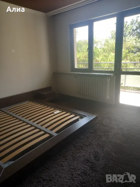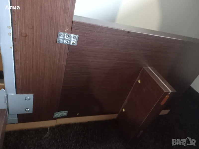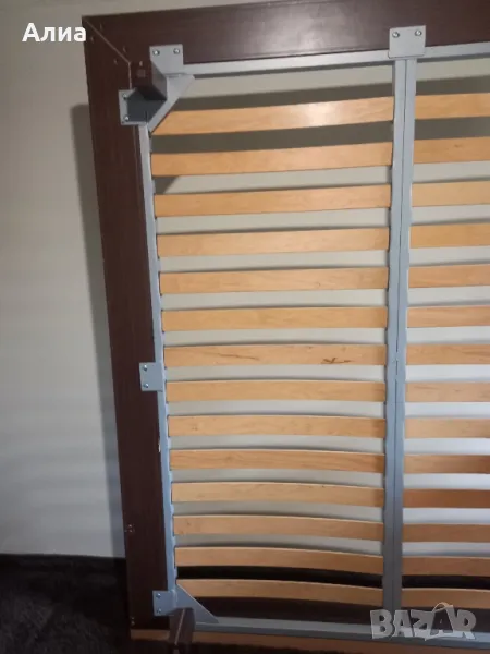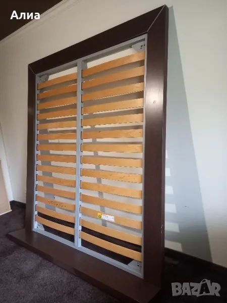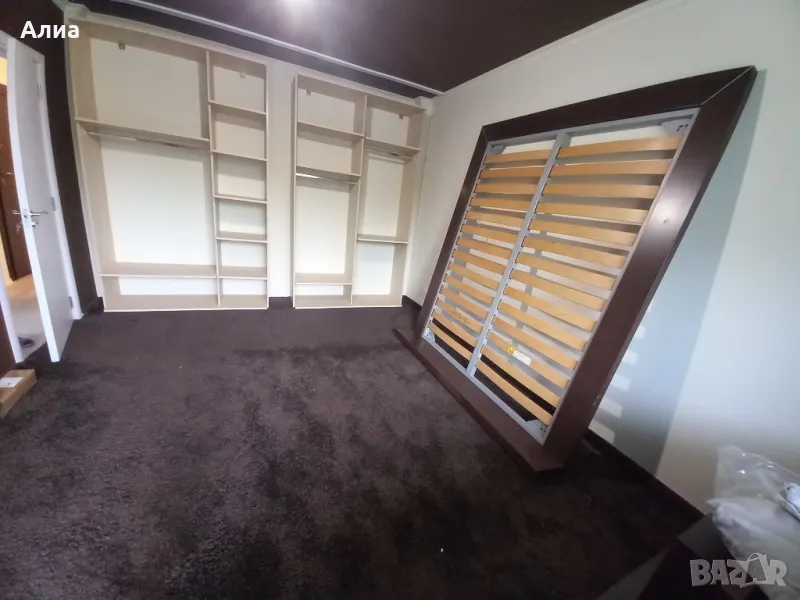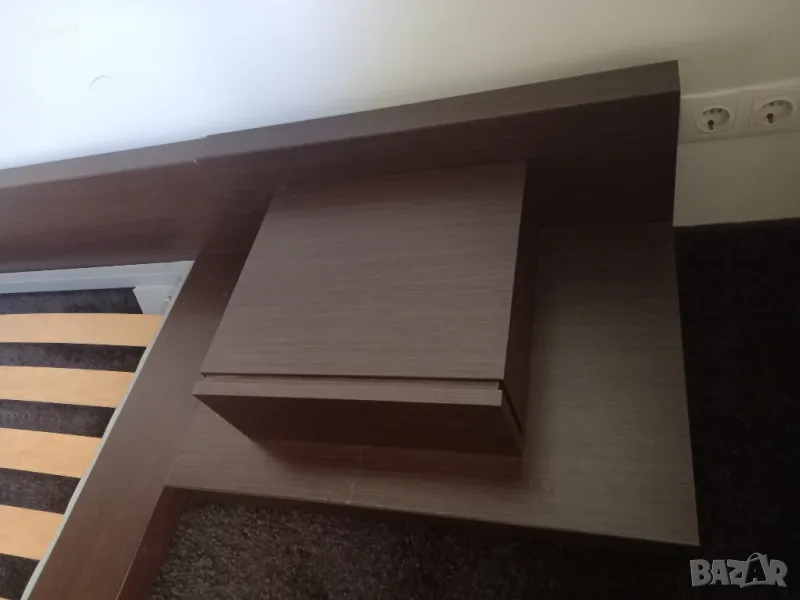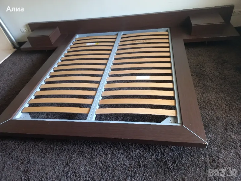 Спалня в кафяво с подматрачна рамка с размери 160х195см. Обща широчина 190 см. Височина на периферията 20см, дървената кафява рамка 20см. Нощни шкафчета 70х50см. Монтирани са за спалнята. Специална конструкция, основата е метална, здраво стояща рамка, на която стои дървената част. изработена по поръчка. Под спалнята има дългокосмест мокет.