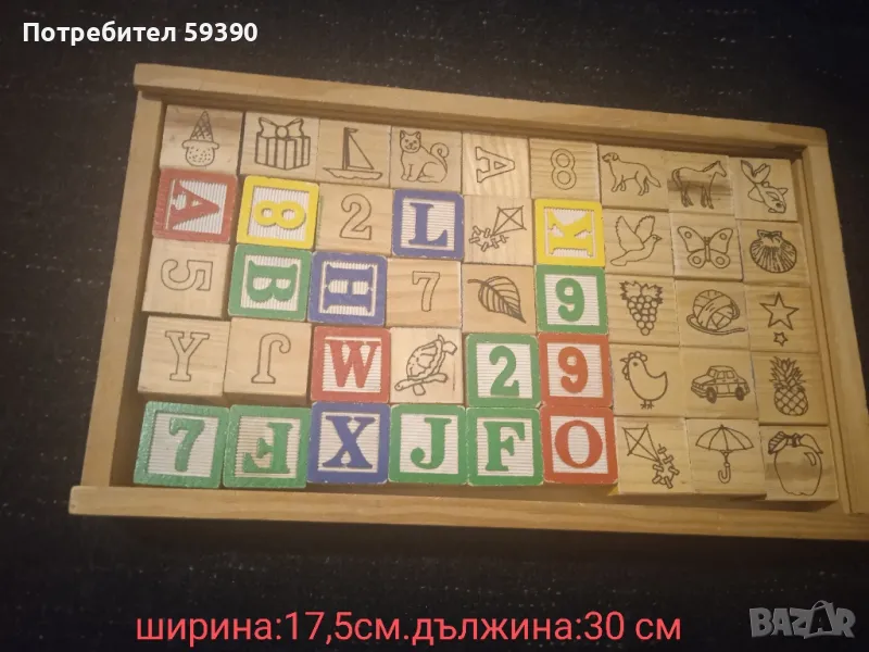 Дървени кубчета с размери 3/3 см.На кутията липсва капака. Размер:17,5/30 см. Азбуката е на латиница,има цифри и знаци,животни.