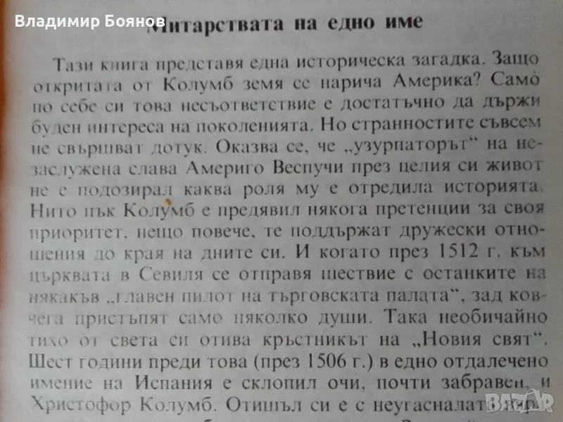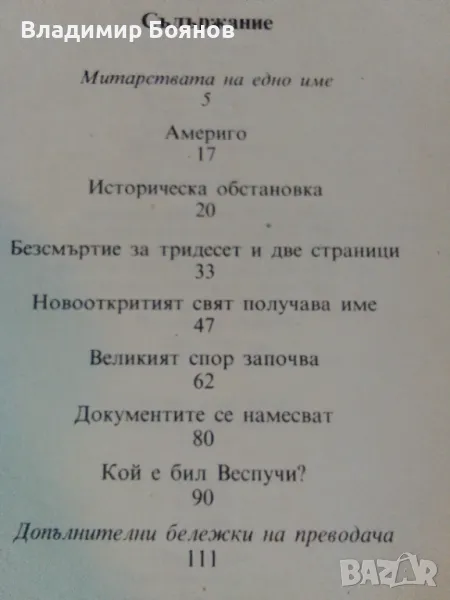 Изследване на автора за живота на Америго Веспучи, мореплаватал и картограф, на чието име е кръстен новооткритият континент. Натрупване на недотам верни исторически данни от съществуващи и съмнителни ръкописи.