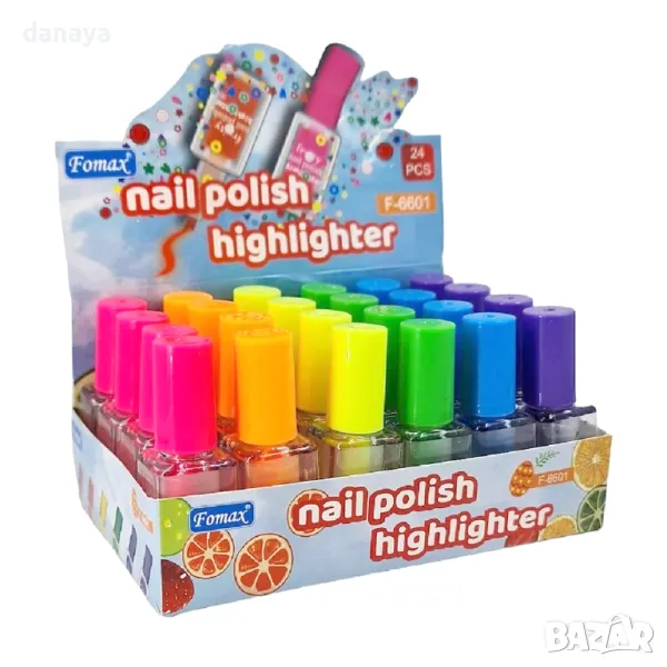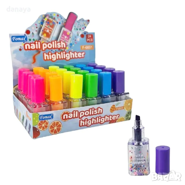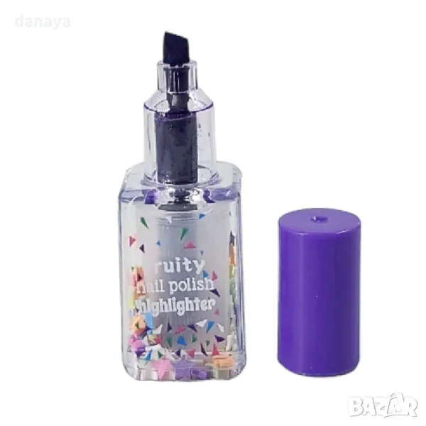 Малък маркер за подчертаване на текст с нестандартна форма на лак за нокти. Шишенцето е допълнително декорирано с множество малки цветни звездички, сърчица, кръгчета или цветчета. Със сигурност ще привлечете внимание към себе си с тези цветни и забавни маркери!