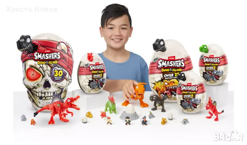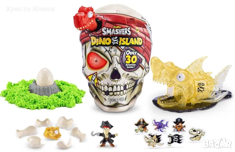 Разбийте своя път към епично праисторическо приключение с Smashers Dino Island Giant Skull. РАЗБИЙ черепа на парчета, за да разкриеш 30-те скрити изненади в този пълен с екшън череп! Търсете в пяна от захарен памук и супер еластична слуз за вашите динозавъри! По пътя се оглеждайте за досадна пиратска фигурка и 5 епични мини яйца, които съдържат всички нови мини герои! Освен това ще откриете златния череп на дино и 6 стикера Smashers сред вашето съкровище на Dino Island. Конструирайте частите на динозавъра, преди да поставите окото на гигантския череп в устата на динозавъра, за да го слушате как реве. Има два праисторически звяра и над 20 мини герои за разбиване и събиране! Ще намерите ли могъщия T-Rex или праисторическата акула Megalodon!? Какво чакате! Бъдете разбиващи, за да откриете своя нов опасно епичен Smashers Dino! Smash, Smash, Smash!: Smashers е уникалното игрово изживяване, което ви позволява да разбивате, разбивате, разбивате! Разбийте гигантския череп на парчета, за да откриете съкровищата на Dino Island. Разбийте 5 яйца с мини изненади, за да оставите мини героите да се разходят из Smashers Dino Island! Възстановете черепа и мини яйцата, за да ги разбиете отново! Дълбоко в съкровището на Smashers ще откриете досадния пират. Ще има ли шанс този пират срещу вашия Smashers Dino? Поставете окото на гигантския си череп в устата на вашия динозавр, за да го слушате как реве и гледайте как окото свети!