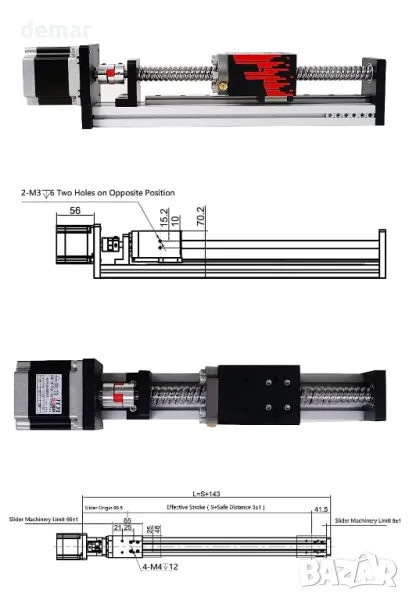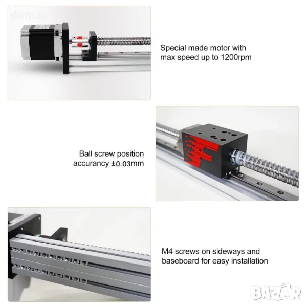 Този високопрецизен линеен водач се отличава с конструкция от оксидиран алуминий за устойчивост на ръжда и повишена стабилност, като поддържа до 25 kg хоризонтално и 20 kg вертикално. Той включва качествен сачмен винт C7 с точност на повторение на позицията от 0,02 mm, предлагащ плавно линейно движение с ниско триене. Ръководството поддържа максимални скорости от 180 mm/s хоризонтално и 80 mm/s вертикално, задвижвани от стъпков двигател Nema 23, достигащ до 1200rpm. Идеални за