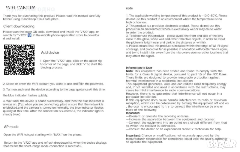 Пълен комплект за инсталация - камера, кабел (без щепсел) и упътване на английски език.