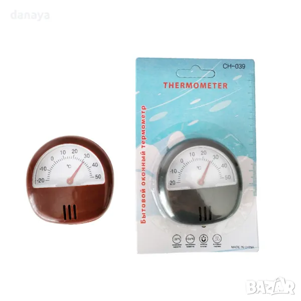 Малък кръгъл термометър, който измерва температурата от -20 до +50 градуса по Целзий. Термометърчето си има вградена стойка, с която може да го поставите навсякъде у дома, освен това с помощта на вграденият магнит може да го поставите на хладилника, или други метални повърхности.