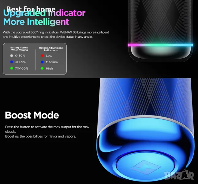 Цветови индикатор за нивното на батерията: Бяла светлина - 0-30%; Синя светлина 31%-69%; Зелена светлина 70%-100%