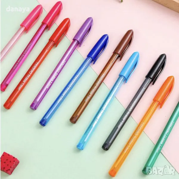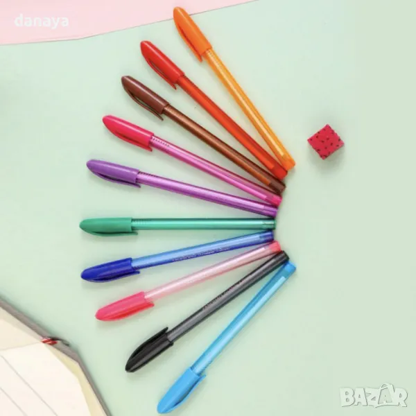 Комплект от 10 броя цветни химикали, 10 различни цвята. Идеални са за писане и подчертаване на важните неща в тетрадката, за изработване на проекти и т.н. Писането с тези химикалки е лесно и удобно, плътното мастило не се разтича върху хартията и не изтича при носене.