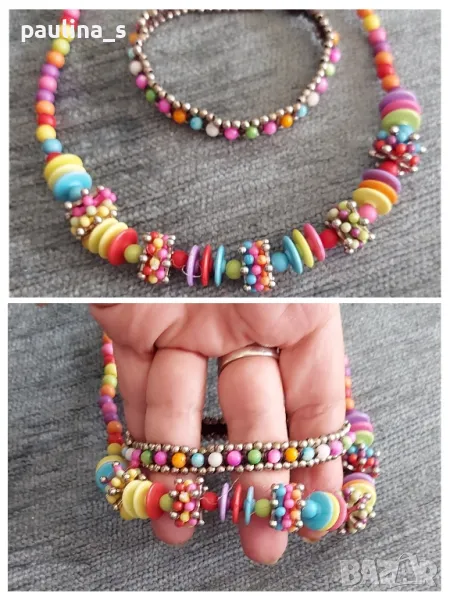 2. Колаж / Много атрактивен и шарен комплект от ръчно изработени бижута, от Мексико. Цената е крайна 14,99лв. Колието тип чокър е на ластична корда и е като ново. Гривната е изплетена на ръка, дължина 18см/19см, топчето на закопчалката е звънче - звъни. Не се делят.