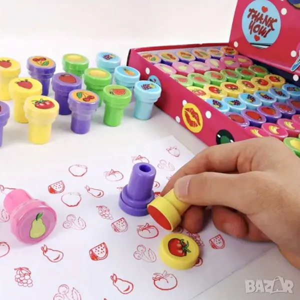 Детски печати за украса и игра. Цветни печати с различни изражения на плодове, общо 10 варианта. Всяко печатче печата в червен цвят.
