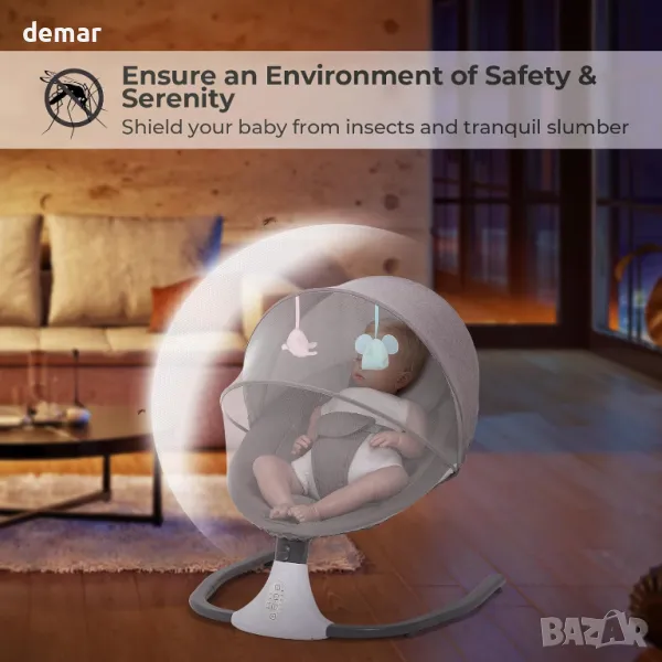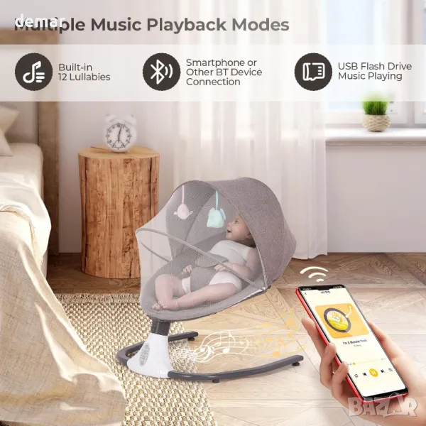 бебешка люлка съчетава удобство и комфорт, включваща 4 регулируеми скорости, 12 предварително зададени приспивни песни и люлеещи се движения, които могат да се персонализират, за да успокоят вашето бебе. Включва дистанционно управление за лесна работа и телефонна връзка за възпроизвеждане на любимата музика на вашето бебе. Люлката е оборудвана с вграден комарник за допълнителна защита и спокойна среда. Изработен от висококачествени материали, той гарантира издръжливост и безопасност, осигурявайки сигурно и удобно пространство за вашето бебе.