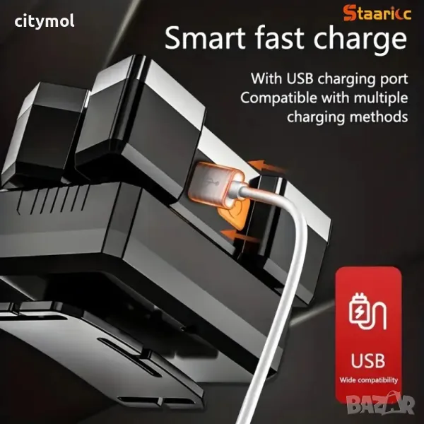 Комплекта включва: акумулаторен челник с вградена батерия, лента и стойка за глава и кабел micro USB за зареждане