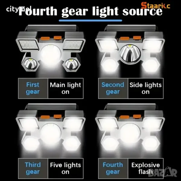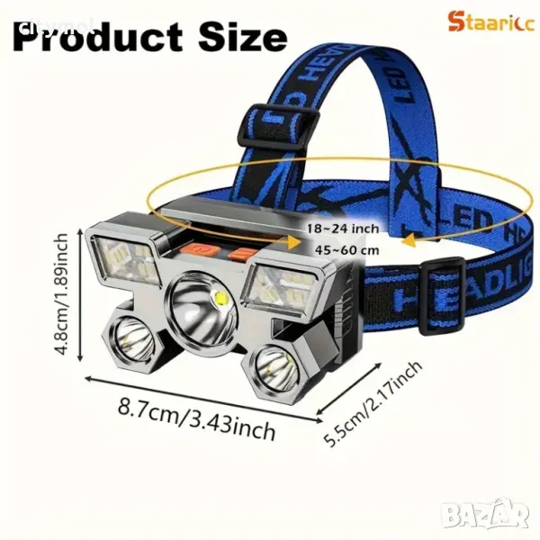 Мощен LED челник за глава, фенер за глава с 5 светлинни източника, CREE LED + COB CREE LED HL-2 HIGH POWER HEADLAMP HL-2. Подходящ за къмпинг, лов, риболов, палатка, велосипед, туризъм, колоездене, планина, кола, преходи, колело, работа, аварии, бягане, шапка, каска.