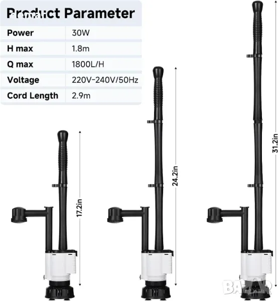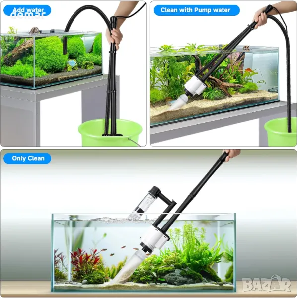 Уредът за почистване на аквариуми AQQA разполага с мощен 30 W двигател от чиста мед с дебит от 1800 L/H за ефективна смяна на вода, пълнене и отстраняване на остатъци. Този многофункционален инструмент 8 в 1 включва смукателна глава за изстъргване и отстраняване на отпадъци, ъглова смукателна глава за събиране на замърсявания, глава с четка за почистване на водорасли, долна смукателна глава за бързо изпомпване, глава за измиване на пясък за почистване на фин пясък, душ за грижа за костенурките, филтърна чаша с памук за филтриране на водата и регулируеми въздушни тръби за оксигенация. Предлага се с 2 м маркуч и три удължителни тръби, осигуряващи лесно регулиране за различни размери на резервоара. Чистачката е лесна за сглобяване и използване, с удобен превключвател на кабела, но трябва да се поддържа редовно, за да се предотврати изгаряне на помпата.
