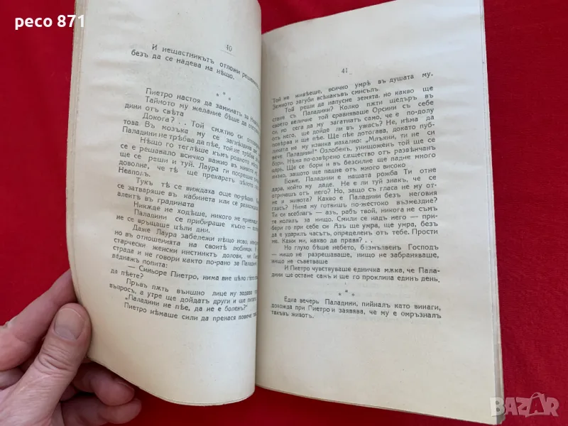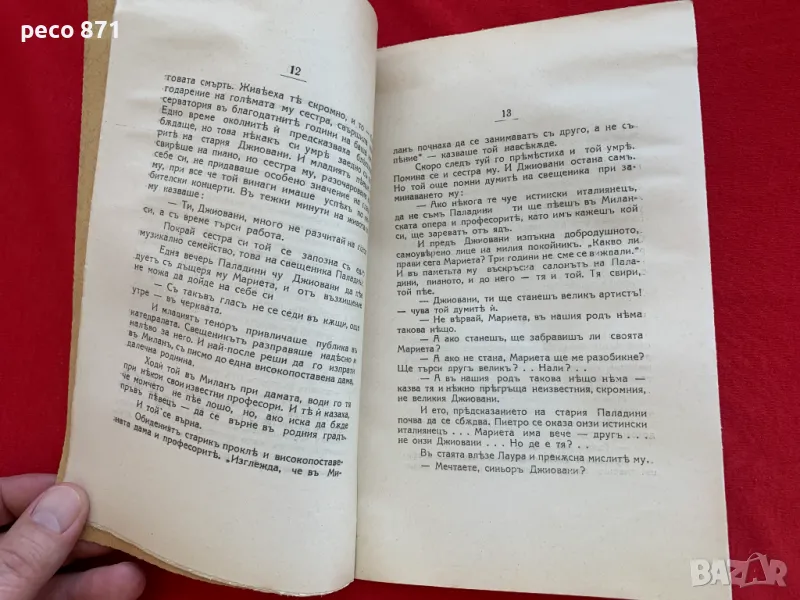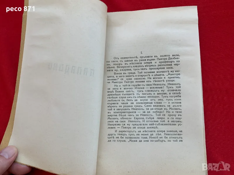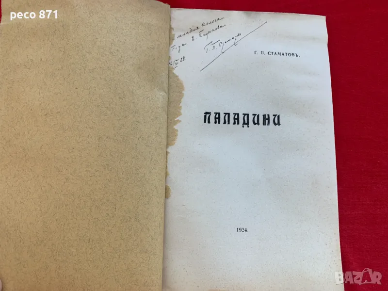 Лично предаване!Състояние,по снимките.Предаване само на лична среща в София,района на Бъкстон или Руски паметник,не работя със спедиторски фирми.Ако имате въпроси,пишете на лични.Първо издание 1924 г.Автограф с посвещение от автора за писателката Евдокия Божкова.Размери 21/13,5 см.,корици меки,54 стр.,зацапване и пожълтяване на корици и последен лист,последните три-четири листа имат леко пожълтяване в края на листа от горната и долната страна.Георги Порфириев Стаматов е съдия и писател в България от имигрирало семейство на бесарабски българи.Учи в Южнославянския пансион при Тодор Минков. След Руско-турската освободителна война се преселва в България с баща си юриста Порфирий Стаматов през 1879 г.Завършва военното училище в София с чин подпоручик. Служи за кратко като офицер в артилерията.Завършва право в Софийския университет.Сред многото познати и приятели на Стаматов и съпругата му Верочка (Вера) е лидерът на широките социалисти депутатът Янко Сакъзов, който е женен за писателката Ана Карима, с която имат 3 деца.Вера Стаматова и Янко Сакъзов обаче се влюбват и той се развежда с Ана. Стаматов хваща Вера под ръка,отвежда я при Сакъзов и си тръгва сам.Стаматов работи като съдия в Кюстендил, Трън и София.След приключването на съдийската си кариера наема (през 1928 г.) за свой дом 3-тия етаж на красивата къща на улица „Юрий Венелин“ 11.Пише основно разкази. Литературната си дейност започва през 90-те години на XIX век, дебютирайки през 1891 г. със стихотворението „Невесел е за мен денят“.Първия си разказ публикува в списание „Мисъл“ през 1893 г.Сътрудничи на списанията „Мисъл“,„Съвременник“,„Листопад“, „Златорог“,„Македоно-одрински преглед“. Близък сътрудник на Македонския таен революционен комитет в Женева. Той е и една от най-солидните връзки на комитета с руските анархисти. За кратко участва в дейността на Вътрешната македоно-одринска революционна организация.