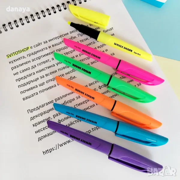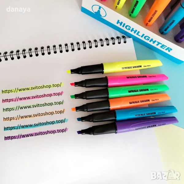 Цветни маркери за подчертаване в ярки неонови цветове. С помощта на маркерите ще можеш да отбележиш най-важното в твоите бележки и записки. Скосен връх, който позволява да правиш тънки и дебели линии. Маркерите са подходящи за всички видове хартия, дори и за факс, а мастилото им изсъхва незабавно.