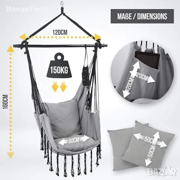 Висящ стол - хамак, 150 кг, сгъваем, поставка за напитки, вътрешен джоб, въртящ се на 360° (сив) - 80.00лв.
