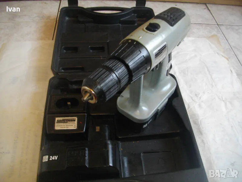 Описание на 24 волта винтоверт немски Манесмън. Цена на комплекта - 89 лв. Мощен и силен винтоверт-дрелка, ударна бормашина.Немско производство на Akku. Комплекта е с много запазен външен вид и техн.състояние - боди о-тлично работи, кутия на зарядното - 24 волта -отлична.