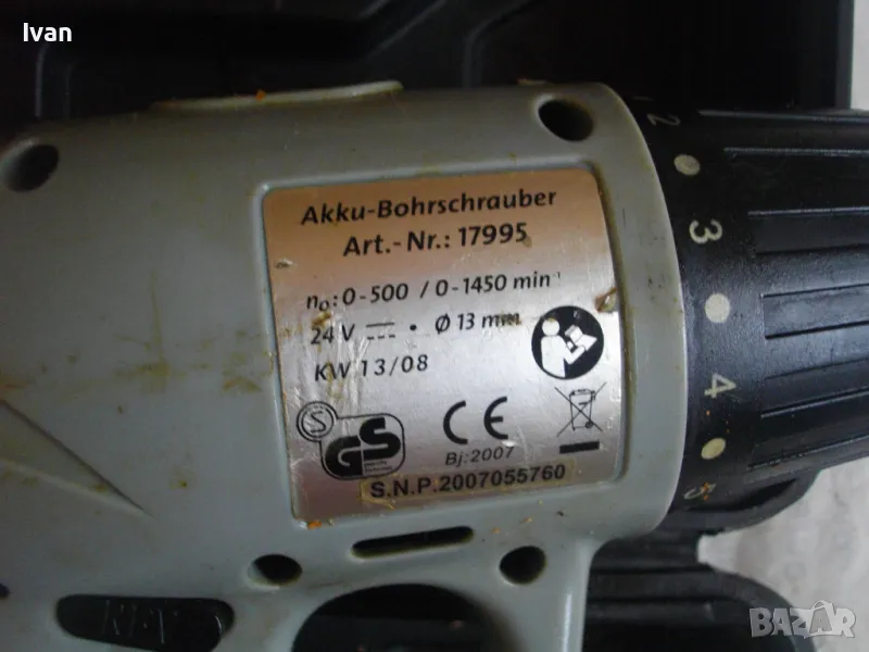 Мощност на мотора-24 волта,2 скорости,обороти-0-500 и 0-1450 оборота в минута.8 степени на натягане,отделно функция пробиване.Патронник-голям,самонатягащ от 2 до 13 мм.Реверс смяна посока.Бърз старт на спусъка-шпиндел.Предна масивна и здрава твърдосплавна дръжка-държач.Задна гумирана нехлъзгаща се дръжка.Батерии-2 броя,оригинални на марката и модела.24 волтови,никел-кадмий елементи.Едната се зарежда и държи ток,другата е слаба.Зарядно и адаптор-оригинални на марката,28 волта,400 милиампера. Комплекта е прибран в оригиналният на марката и модела твърдосплавен куфар.Забележка-едната батерия се зарежда и вдига волтаж около 25 волта,другата-не се зарежда до номинала си.Не завърта-явно има лоши елементи.Цената е съобразена със забележката.
