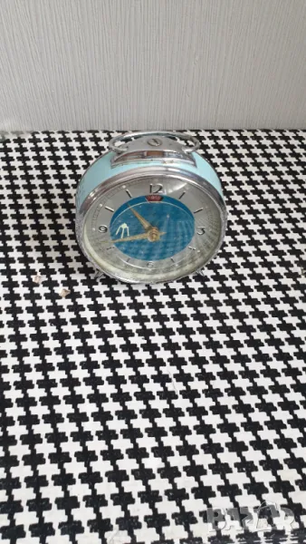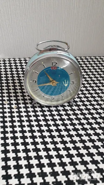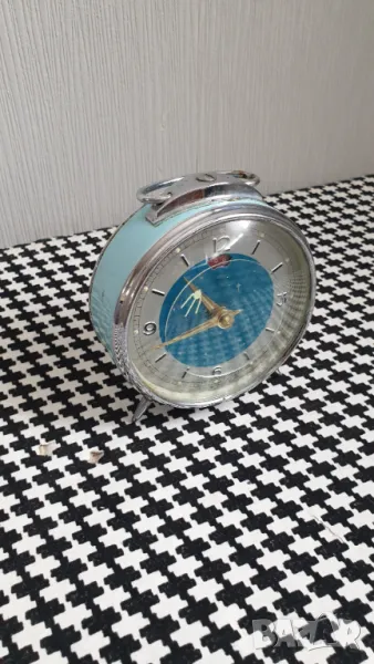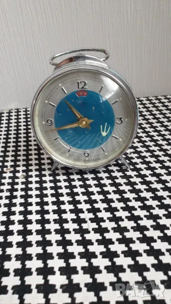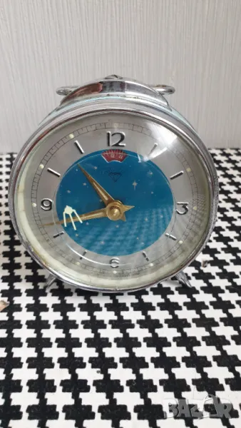 Автентичен стар механичен часовник будилник космос, произведен през 1960'те години. Когато часовника работи спътника се върти около циферблата.
