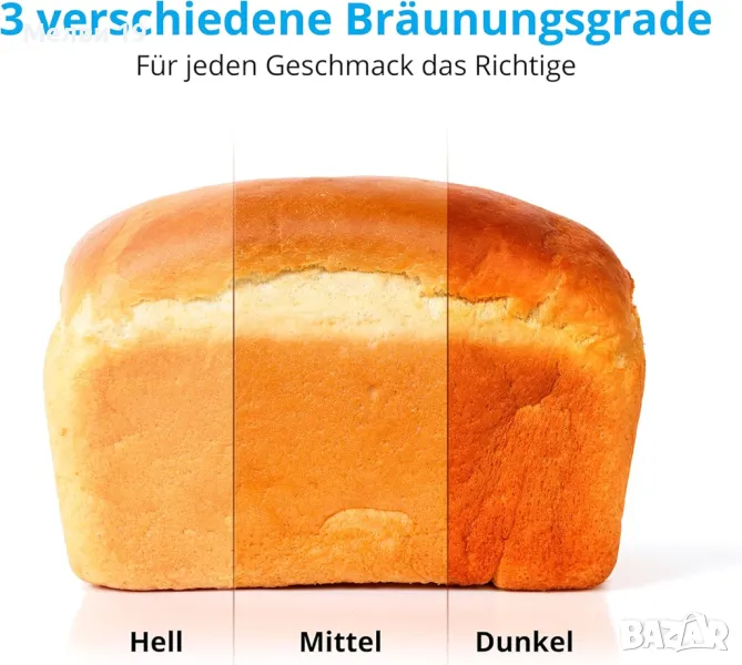 Хлебопекарна с мощност 550 вата, 19 програми за печене, функция за затопляне и 3 различни степени на запичане.