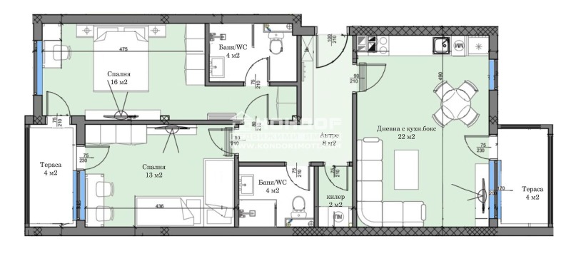 Оферта 65163:Бутиков затворен жилищен комплекс с модерна и устойчива архитектура, потопена в богато озеленени площи, вдъхващи на живущите комфорт и спокойствие. Комплекса предлага просторна спокойна среда с бърз достъп до центъра на града, както и възлови булеварди. Предлагаме ви тристаен апартамент, състои се от дневна с трапезария и кухненска част 22кв.м. с излаз на тераса, две самостоятелни спални ситуирани в отделен коридор: родителска 16кв.м. със собствена баня, детска 13кв.м., втора баня с тоалетна, склад, входно антре с място за гардероб и една тераса обща за спалните. В близост са ситуирани ресторанти, хипермаркети, училища и детски градини. Ще се изградят луксозни общи части с предоставено облагородено дворно място, пейки за отдих и детски площадки за игра.