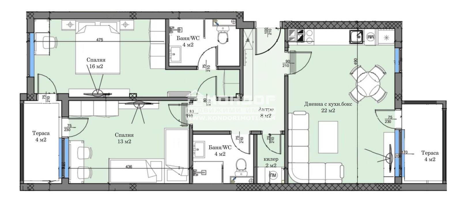 Оферта 65163:Бутиков затворен жилищен комплекс с модерна и устойчива архитектура, потопена в богато озеленени площи, вдъхващи на живущите комфорт и спокойствие. Комплекса предлага просторна спокойна среда с бърз достъп до центъра на града, както и възлови булеварди. Предлагаме ви тристаен апартамент, състои се от дневна с трапезария и кухненска част 22кв.м. с излаз на тераса, две самостоятелни спални ситуирани в отделен коридор: родителска 16кв.м. със собствена баня, детска 13кв.м., втора баня с тоалетна, склад, входно антре с място за гардероб и една тераса обща за спалните. В близост са ситуирани ресторанти, хипермаркети, училища и детски градини. Луксозни общи части с предоставено облагородено дворно място, пейки за отдих и детски площадки за игра.