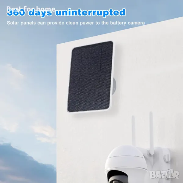 365 дни слънчево захранване: Този слънчев панел може непрекъснато да абсорбира слънчева енергия и да поддържа захранването на камерата за наблюдение. Няма нужда често да деинсталирате камерата и да я зареждате ръчно отново.